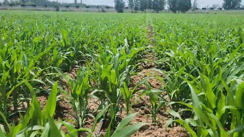 今年山東奧龍按照菏澤魯西新區(qū)農(nóng)戶要求,研發(fā)生產(chǎn)了一款高產(chǎn)新模式玉米播種機。該機采用大小行配置、每穴雙粒,畝株數(shù)7400~8000顆,深施玉米專用緩釋肥,小行中間鋪滴灌帶。目前,玉米長勢良好。
